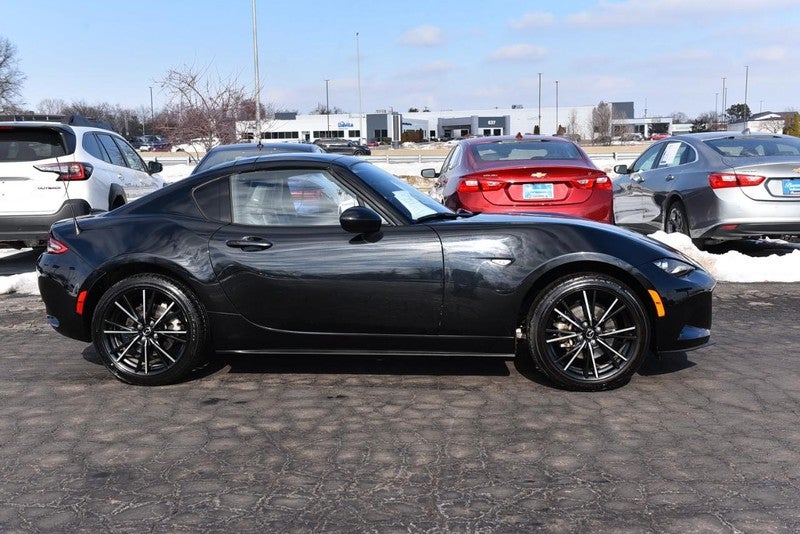 CARFAX One-Owner. Jet Black Mica 2025 Mazda MX-5 Miata RF Grand Touring RWD 6-Speed Automatic 2.0L 4-Cylinder DOHC 16V 17" black metallic finish alloy wheels, 4-Wheel Disc Brakes, 9 Speakers, ABS brakes, Air Conditioning, Alloy wheels, AM/FM radio: SiriusXM, AppLink/Apple CarPlay and Android Auto, Auto High-beam Headlights, Auto-dimming door mirrors, Auto-dimming Rear-View mirror, Automatic temperature control, bose audio system with audiopilot, Brake assist, Bumpers: body-color, Convertible HardTop, Convertible roof lining, Convertible roof wind blocker, Delay-off headlights, Driver vanity mirror, Dual front impact airbags, Dual front side impact airbags, Electronic Stability Control, Emergency communication system: MAZDA CONNECT, Exterior Parking Camera Rear, Four wheel independent suspension, Front anti-roll bar, Front Bucket Seats, Front Center Armrest, Fully automatic headlights, Garage door transmitter: HomeLink, Glass rear window, Heated door mirrors, heated front bucket seats, Heated front seats, Illuminated entry, Leather Shift Knob, leather-trimmed upholstery, Low tire pressure warning, MAZDA CONNECT Infotainment system, Navigation System, Occupant sensing airbag, Outside temperature display, Panic alarm, Passenger vanity mirror, Power convertible roof, Power door mirrors, Power steering, Power windows, Radio data system, Rain sensing wipers, Rear anti-roll bar, Rear window defroster, Remote keyless entry, Speed control, Speed-sensing steering, Sport steering wheel, Steering wheel mounted audio controls, Tachometer, Telescoping steering wheel, Tilt steering wheel, Traction control, Trip computer, Variably intermittent wipers.