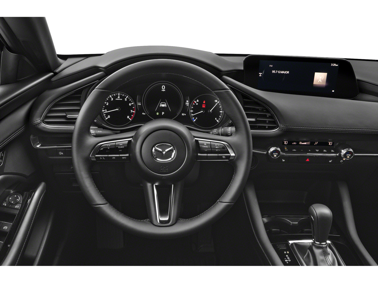 This Mazda Mazda3 is well equipped with 4-Wheel Disc Brakes, 6 Speakers, ABS brakes, Air Conditioning, Alloy wheels, AM/FM radio, AppLink/Apple CarPlay and Android Auto, Auto High-beam Headlights, Automatic temperature control, Brake assist, Bumpers: body-color, Compass, Delay-off headlights, Driver door bin, Driver vanity mirror, Dual front impact airbags, Dual front side impact airbags, Electronic Stability Control, Emergency communication system: Mazda Connected Services (3-year complimentary trial included), Exterior Parking Camera Rear, Front anti-roll bar, Front Bucket Seats, Front Center Armrest, Front dual zone A/C, Front reading lights, Front wheel independent suspension, Fully automatic headlights, Heated door mirrors, Illuminated entry, Knee airbag, Leather Shift Knob, Leather steering wheel, Leatherette Seat Trim, Low tire pressure warning, MAZDA CONNECT Infotainment System, Occupant sensing airbag, Outside temperature display, Overhead airbag, Overhead console, Panic alarm, Passenger door bin, Passenger vanity mirror, Power door mirrors, Power steering, Power windows, Radio data system, Radio: AM/FM Audio System, Rain sensing wipers, Rear seat center armrest, Rear side impact airbag, Rear window defroster, Rear window wiper, Remote keyless entry, Speed control, Speed-sensing steering, Split folding rear seat, Spoiler, Steering wheel mounted audio controls, Tachometer, Telescoping steering wheel, Tilt steering wheel, Traction control, Trip computer, Turn signal indicator mirrors, Variably intermittent wipers, and Wheels: 18" x 7J Aluminum Alloy.