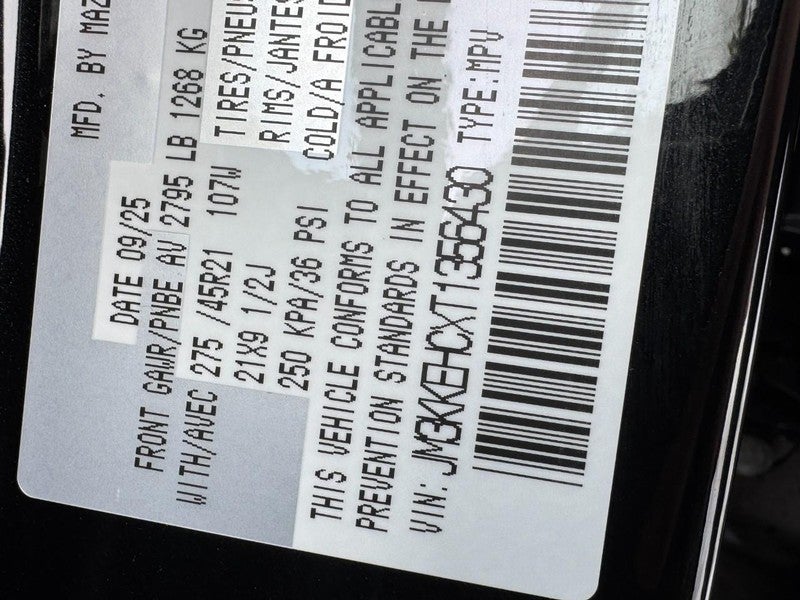 Mazda Certified Pre-Owned Certified, 12 Speakers, 3rd row seats: bench, 4-Wheel Disc Brakes, ABS brakes, Air Conditioning, All Weather Floor Mats - Captains Chairs, Alloy wheels, AM/FM radio: SiriusXM, Auto High-beam Headlights, Auto-dimming door mirrors, Auto-dimming Rear-View mirror, Automatic temperature control, Brake assist, Bumpers: body-color, Cargo Tray with Seatback Protection - Captain Chairs, Compass, Delay-off headlights, Driver door bin, Driver vanity mirror, Dual front impact airbags, Dual front side impact airbags, E911 Automatic Emergency Notification, Electronic Stability Control, Emergency communication system: MAZDA CONNECT, Four wheel independent suspension, Front anti-roll bar, Front Bucket Seats, Front Center Armrest w/Storage, Front dual zone A/C, Front reading lights, Fully automatic headlights, Garage door transmitter: HomeLink, Heads-Up Display, Heated door mirrors, Heated front seats, Heated rear seats, Heated steering wheel, Heated/Ventilated Front Bucket Seats, Illuminated entry, Infotainment System Voice Command, Knee airbag, Leather Shift Knob, Leather steering wheel, Low tire pressure warning, Mazda Connected Services, Mazda Online Navigation, Memory seat, Nappa Leather Seat Trim, Navigation system: MAZDA CONNECT, Occupant sensing airbag, Outside temperature display, Overhead airbag, Overhead console, Panic alarm, Passenger door bin, Passenger vanity mirror, Power door mirrors, Power driver seat, Power Liftgate, Power moonroof, Power passenger seat, Power steering, Power windows, Radio Broadcast Data System Program Information, Radio data system, Radio: : AM/FM w/HD/Bose 12-Speaker Sound System, Rain sensing wipers, Rear air conditioning, Rear anti-roll bar, Rear reading lights, Rear seat center armrest, Rear window defroster, Rear window wiper, Remote keyless entry, Security system, SMS Text Msg Audio Delivery and Reply, Speed control, Speed-sensing steering, Splash Guards, Split folding rear seat, Spoiler, Steering wheel memory, Steering wheel mounted audio controls, Tachometer, Telescoping steering wheel, Tilt steering wheel, Traction control, Trip computer, Turn signal indicator mirrors, Variably intermittent wipers, Ventilated front seats, Ventilated rear seats, Wheel Locks, Wheels: 21" x 9.5j Machine Cut Aluminum Alloy.